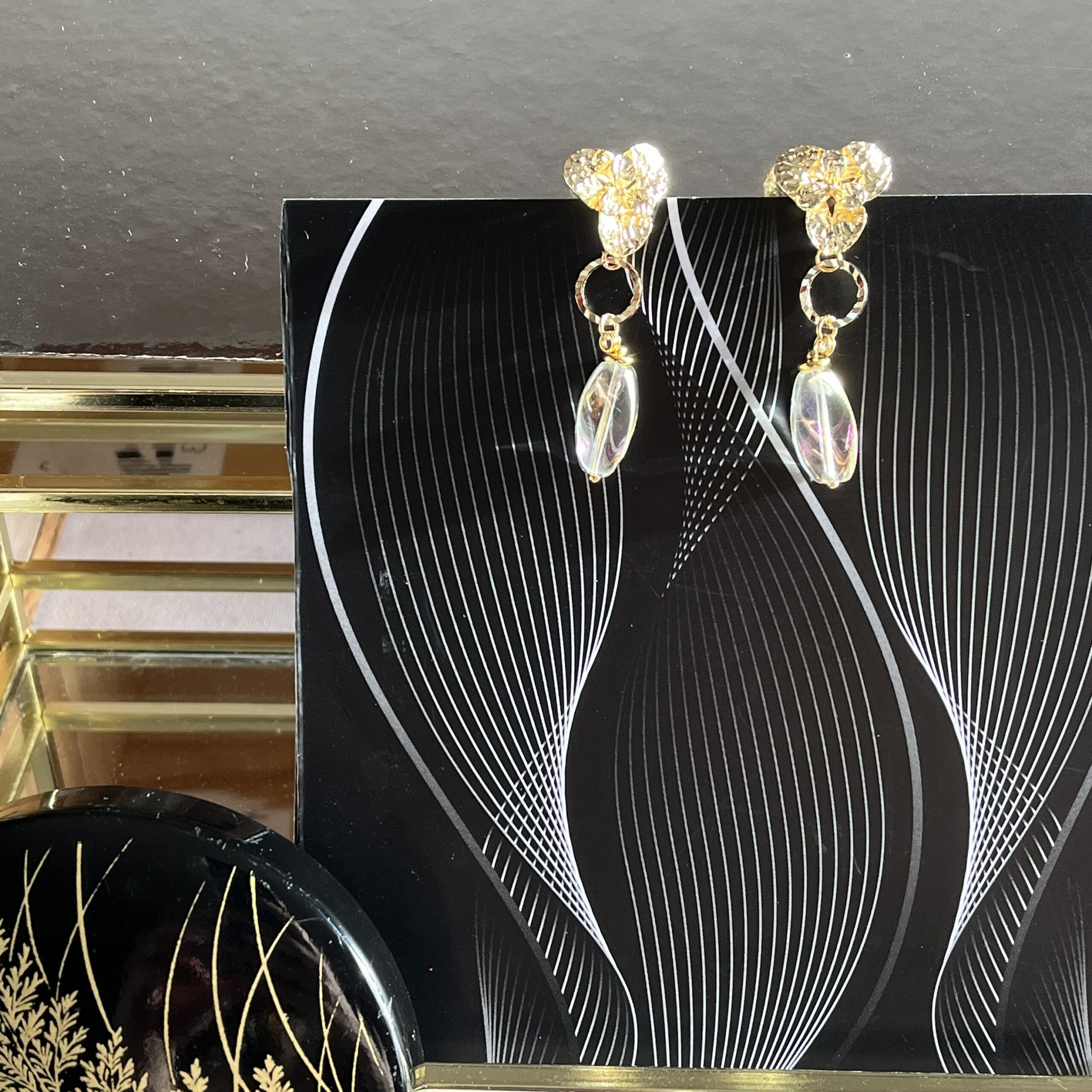 Boucles d’oreilles composées avec une perle en verre effets « boréales », des anneaux, perles et attaches dorés à l’or fin 24 carats. Dimension de la partie suspendue : 3 cm. Dimension de l’attache qui repose sur le lobe : 1 cm.