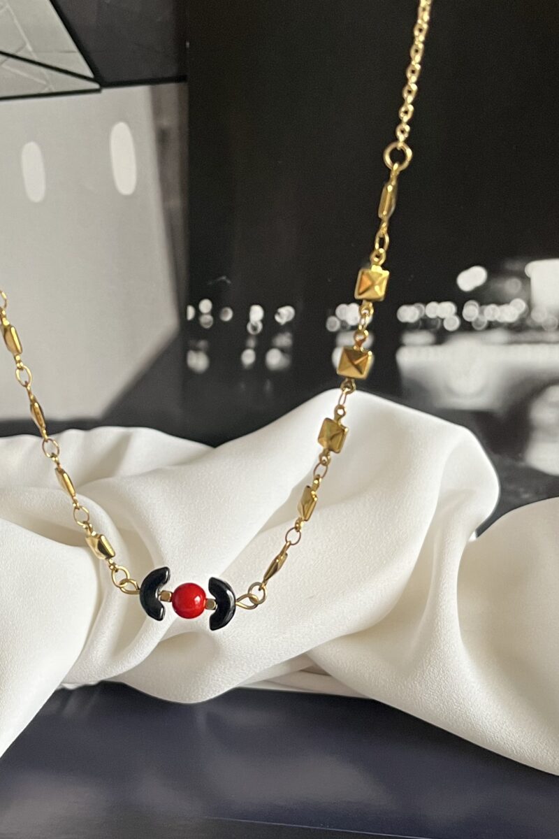 Collier avec chaîne en acier doré et perles en verre, agates. Longueur ajustable de 41 à 45 cm.